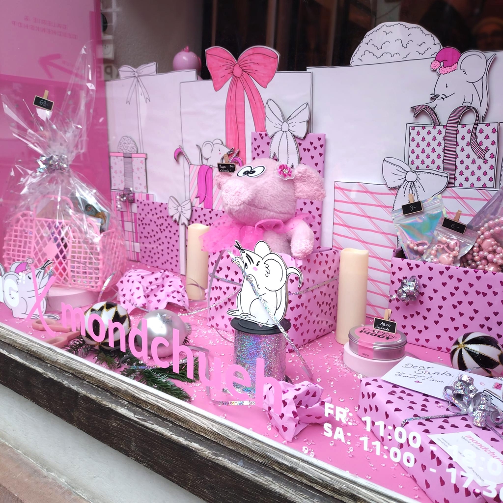 In this charming street, you’ll also find Piggy’s Posh Art: a quirky, unapologetically pink shop. One of my favorite projects in 2025 was designing a pink Christmas shop window for this space.